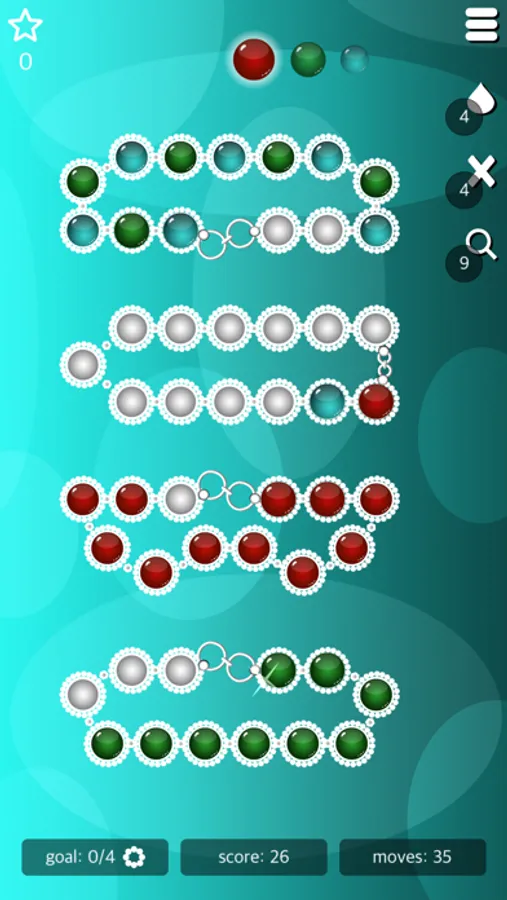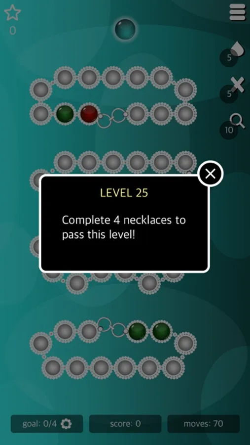 Match the patterns in each level and complete as many necklaces as possible. To pass a level, you need to fulfil the level's goal before you're out of moves.
