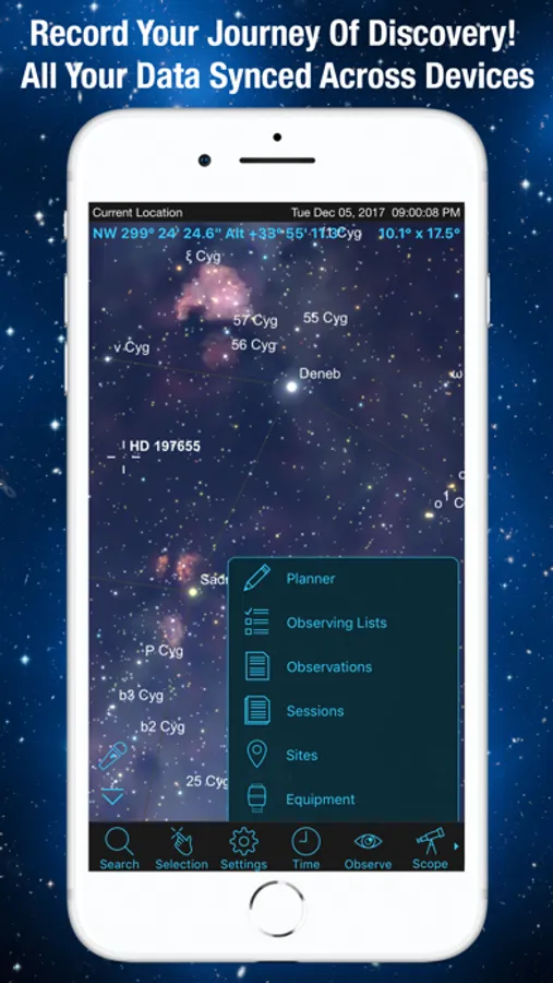 9) Share It. SkySafari 6 is more than just a mobile app, it’s a new system to help organize and share your observing experiences. With a free signup, you can see and share your observing data from our web portal, LiveSky.com! Affordable premium memberships add online editing, so you can not only view, but edit your observations, add new observing sites, manage your equipment and more. Finally, (coming soon) you can view, edit and manage your settings files with SkySafari Web, our fully functional web version.