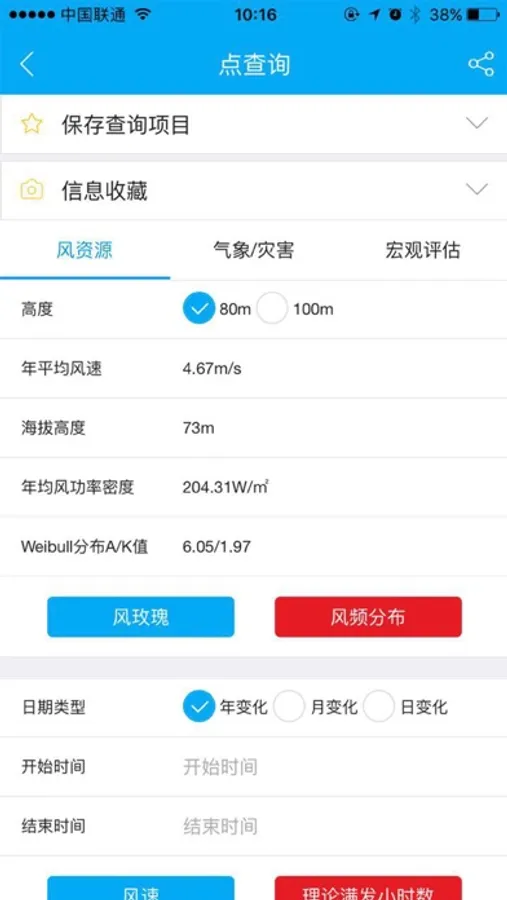 风能资源查询:快速查询任意感兴趣点或区域海拔高程、空气密度、风速、湿度、威布尔分布等风资源参数;