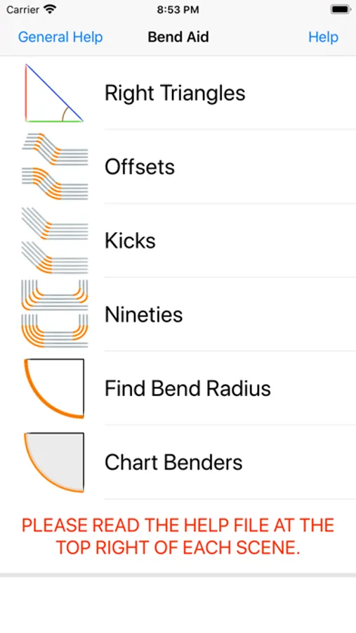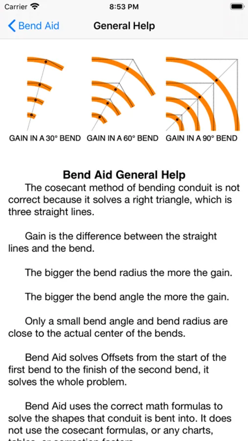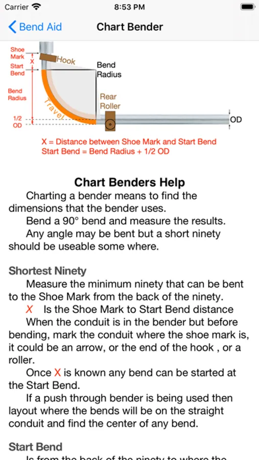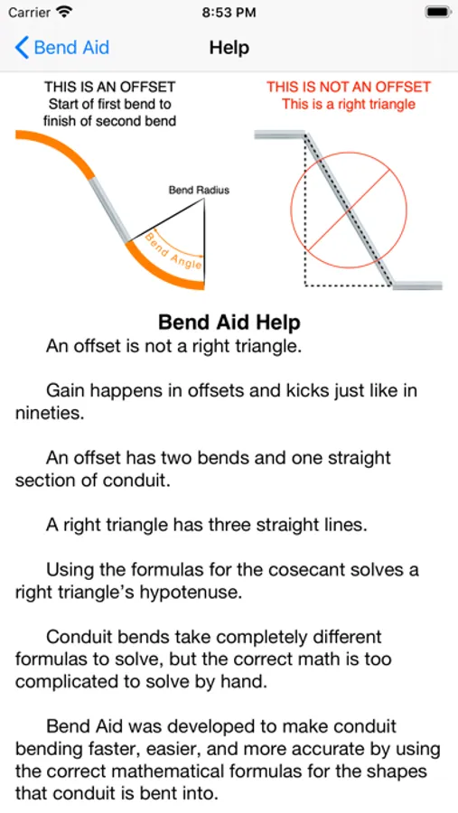 Bend Aid shows you what bends, to put where, and how long the conduit, or any pipe, must be placed to meet the variables that were entered so that the conduit, or any pipe, may be cut and threaded as needed.