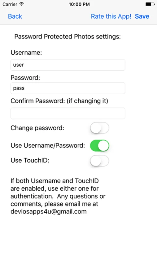 Password Protected Photos is a secured storage location for your pictures. The default username is user and the default password is pass. Again, user / pass to login the first time and then go to Setting to change them to whatever you like. You can also enable TouchID instead so either way will authenticate you into the application.