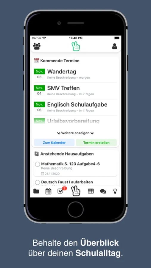 Hausaugaben stehen klassenweit zur Verfügung. Über offene Hausaufgaben wird man per Push-Nachricht benachrichtigt und hat die Möglichkeit Lösungen digital abzugeben.