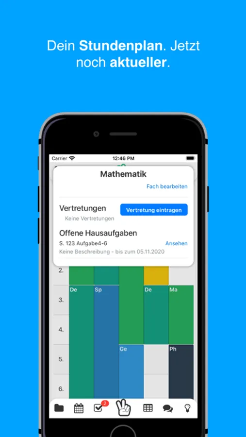 Der tagesaktuelle Stundenplan aktualisiert sich selbstständig, so bist du immer auf dem neusten Stand.