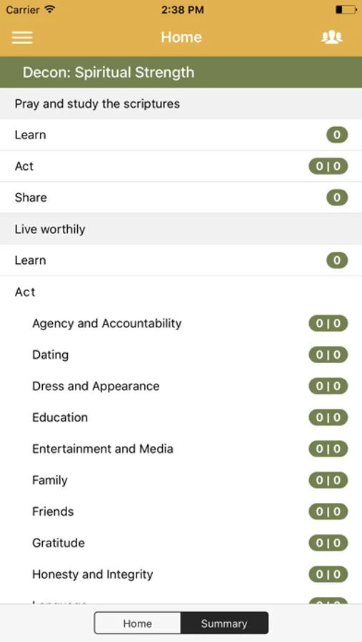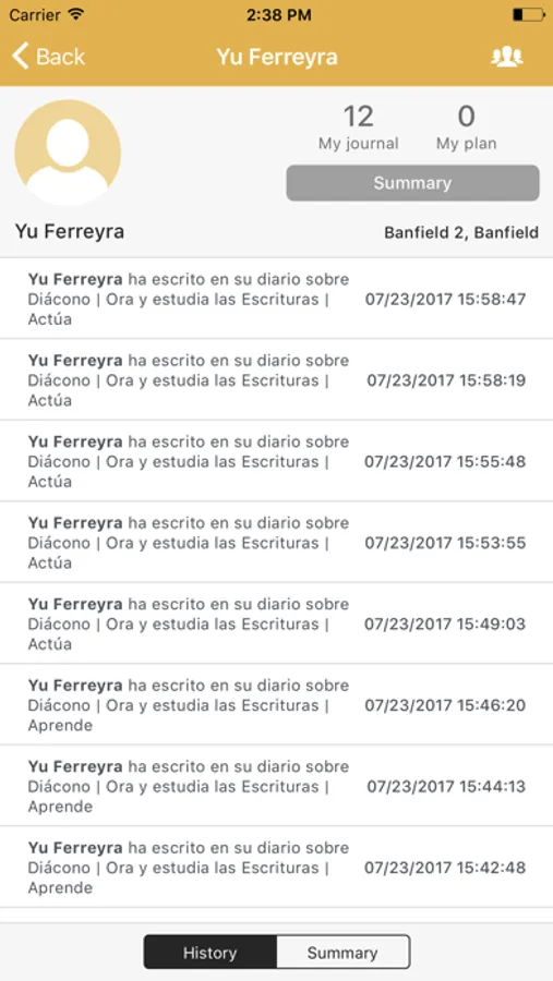 3. Tiene una sección donde se ven todos los items de Mi Deber a Dios y puede ver rápidamente sobre cuales se escribieron planes pero no se escribió en el diario, lo que puede ser una oportunidad para hablar con el joven.