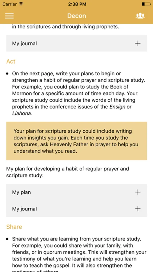 -Los Amigos, Padres y líderes,(seguidores) podrán seguir al joven al bajarse la aplicación. Los que sigan no podrán ver un detalle de lo que escribe el joven, pero si saber bajo que tópico escribió. Esto se hizo así para motivar a los adultos, a que cuando le llegue una notificación de que el joven completo algo pueda ir y entrevistarlo para poder conocer que meta se puso y así poder ayudarlo. La aplicación no viene a remplazar el contacto cara a cara, sino a brindar una ayuda a que este contacto sea más seguido y personal. A los presidentes de quórum, les brinda una ayuda para invitar a otros jóvenes del mismo a poder charlar sobre los planes que se pusieron.