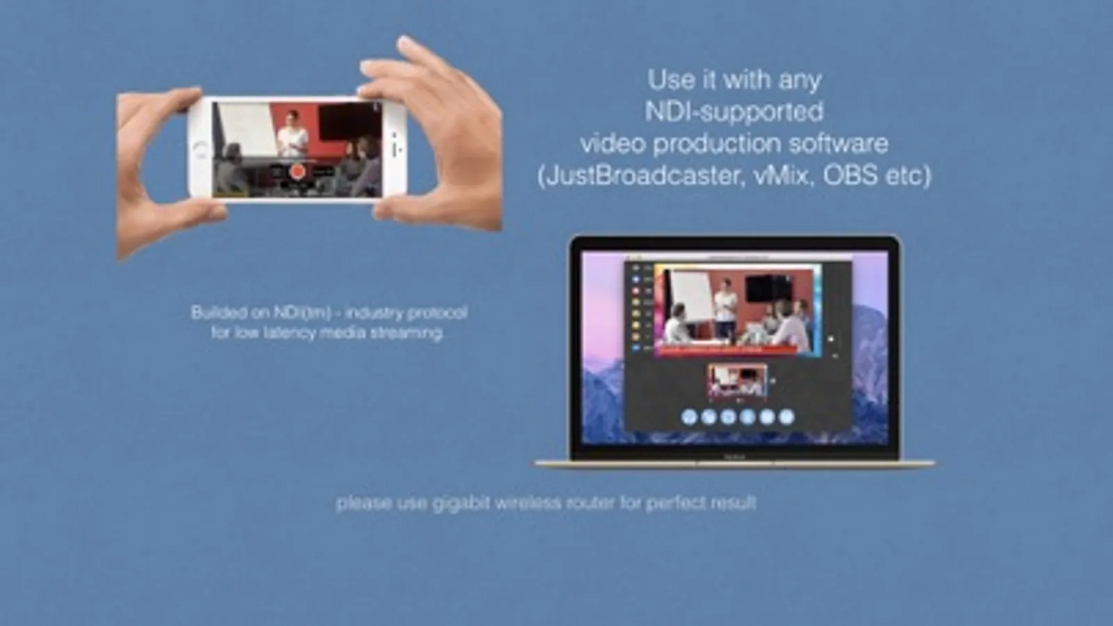 Our app use NDI protocol - NewTek’s NDI™ (Network Device Interface) is a low latency IP video protocol developed especially for professional live video production, and is supported by an extensive list of broadcast systems from many manufacturers.