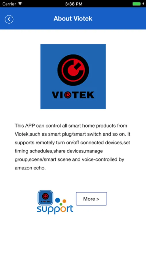 This APP can control all smart home products from Viotek,such as smart plug/smart switch and so on. It supports remotely turn on/off connected devices,set timing schedules,share devices,manage group,scene/smart scene and voice-controlled by amazon echo.