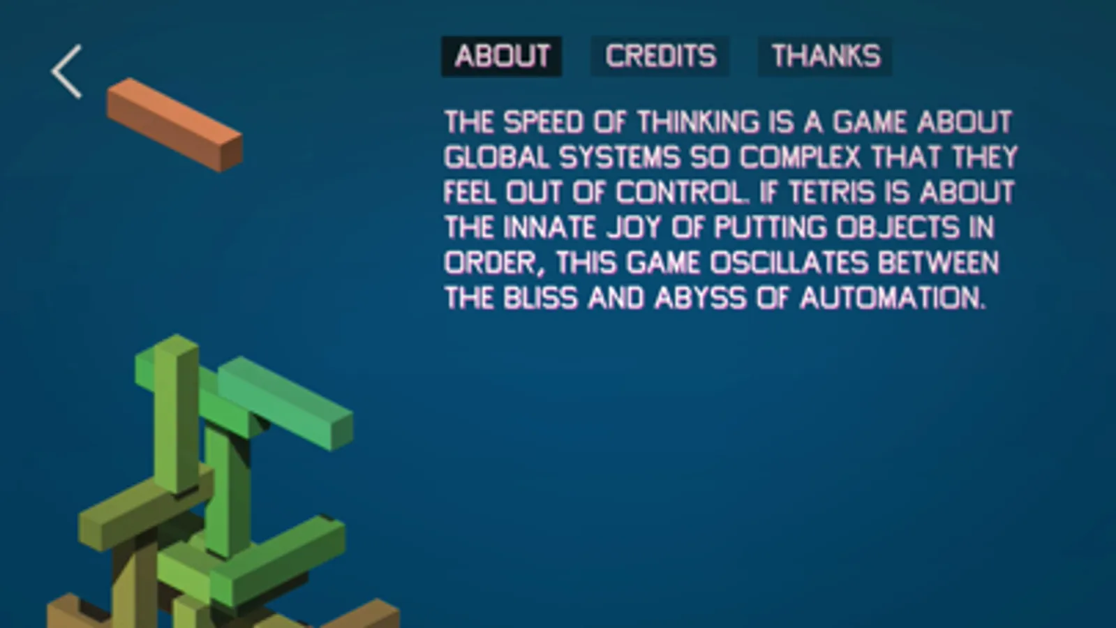 The Speed of Thinking is a game about global systems so complex that they feel out of control. If Tetris is about the innate joy of putting objects in order, this game oscillates between the bliss and abyss of automation.