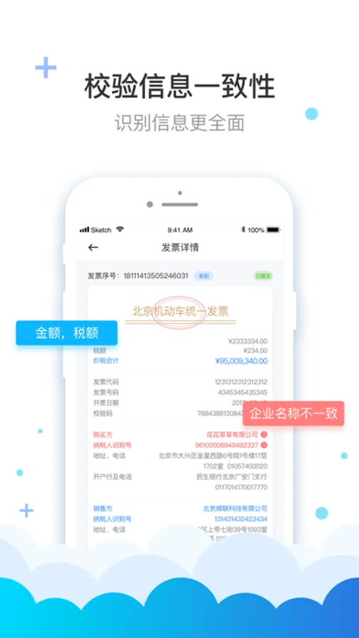 提取发票所有信息,包括开票日期、发票号码、企业名称、纳税人识别号、发票内容、金额、税额、税率等,并自动校验企业名称和纳税人识别号是否和企业信息一致。