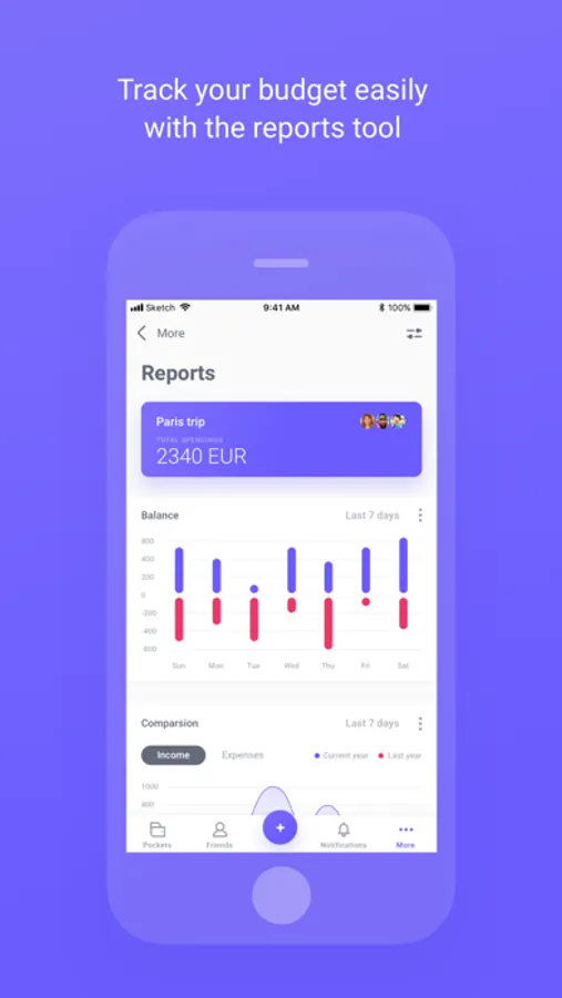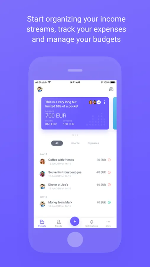 Use it to keep track of multiple income streams, to share gas expenses, rent & utilities, pay for expenses for a business trip from a „company pocket” and for a holiday from a „family pocket”. You can budget events both large and small scale, and save for medium and long-term goals.