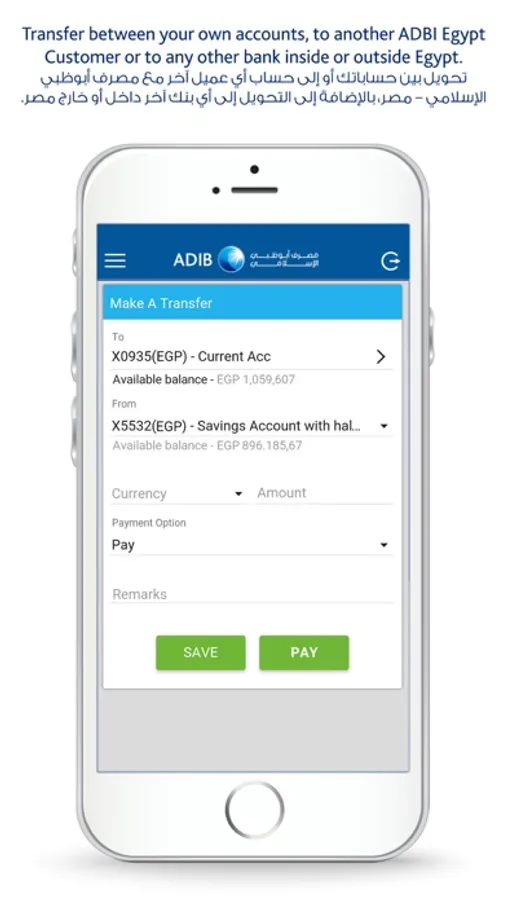 By simply logging in with your same ADIB Egypt Internet Banking Username and Password, you can now enjoy a variety of banking services - from the palm of your hand - on the different types of accounts in addition to conducting financial transactions within and outside your own accounts.