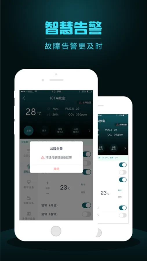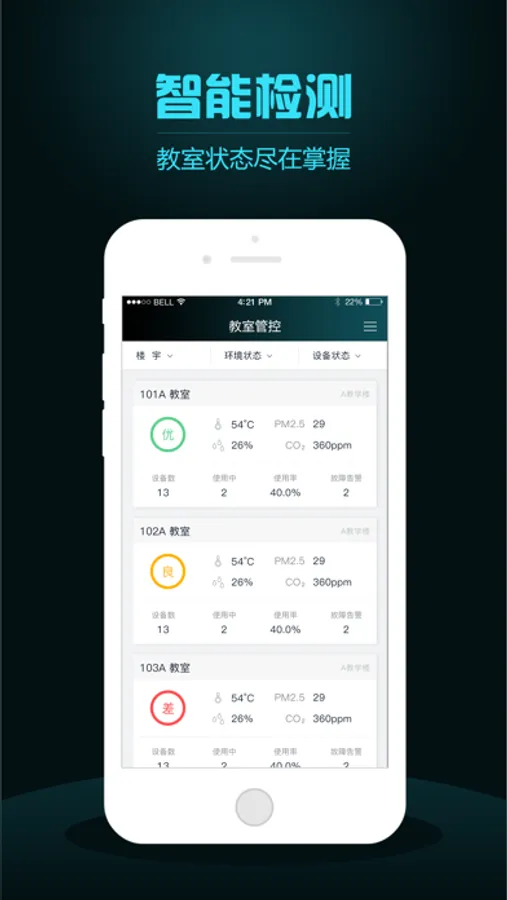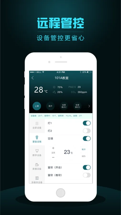智管理,实现对教室设施设备的移动控制、故障告警、运行状态感知。随时随地远程管理和控制教室设备,场景模式一键操作,满足各种各样的教与学场景切换。实时监测教室环境状态及设备状态,故障异常第一时间告警,让教室设备维护更加及时。智管理,让教室管理更智能。