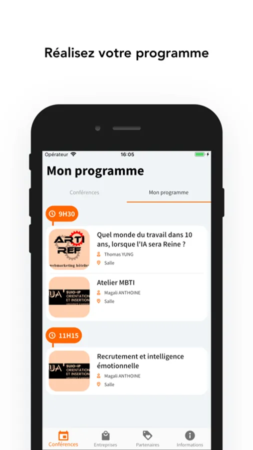 - D'organiser le programme de votre journée selon vos besoins parmi les conférences, ateliers et rencontres ;