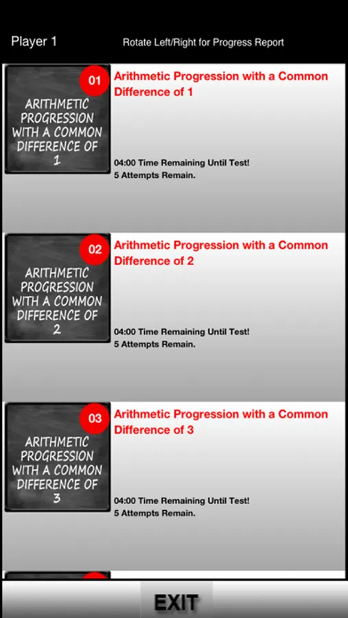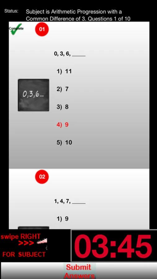 -Upon selection of the desired subject, an arithmetic progression table is presented that is relevant to that subject and the subsequent ten questions.