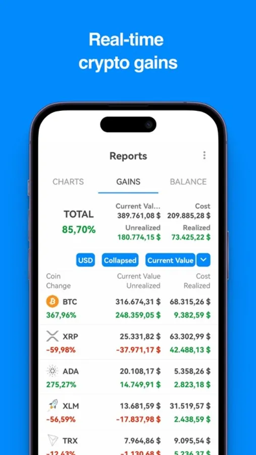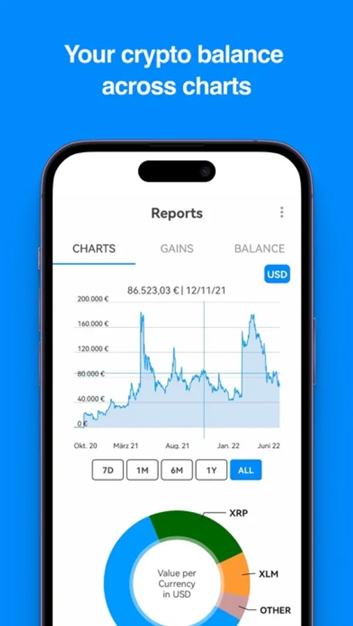 With the CoinTracking app, you can visually track your favorite cryptocurrencies with advanced charts and stats (e.g., portfolio distribution, historical balances) while being on top of actionable market indicators.