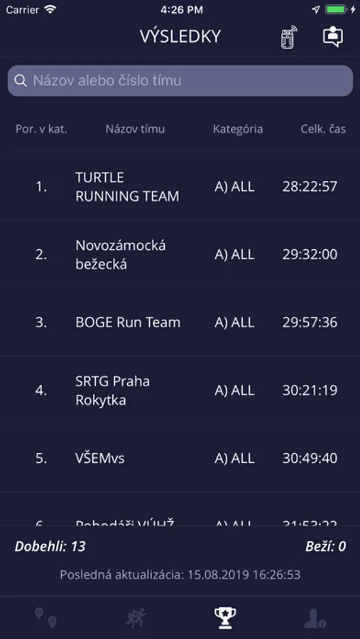 Výsledky sú aktualizované v reálnom čase pre jednotlivé úseky, tímy a celkové poradie tímov v cieli.