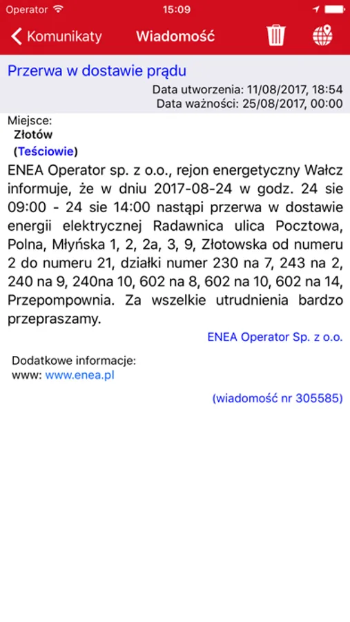 - o planowanych przerwach w dostawie wody, prądu, gazu itp.