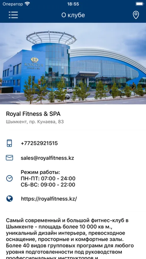 Royal Fitness & SPA – это единственный фитнес-клуб премиум-класса в ЮКО. Это поистине классическое сочетание здоровья, красоты и комфорта. Клуб оснащен оборудованием от мировых лидеров фитнес-индустрии компаниями Life Fitness и Hammer Strength, а команда, состоящая из настоящих звезд фитнеса и спорта, позволит достичь любых поставленных целей.