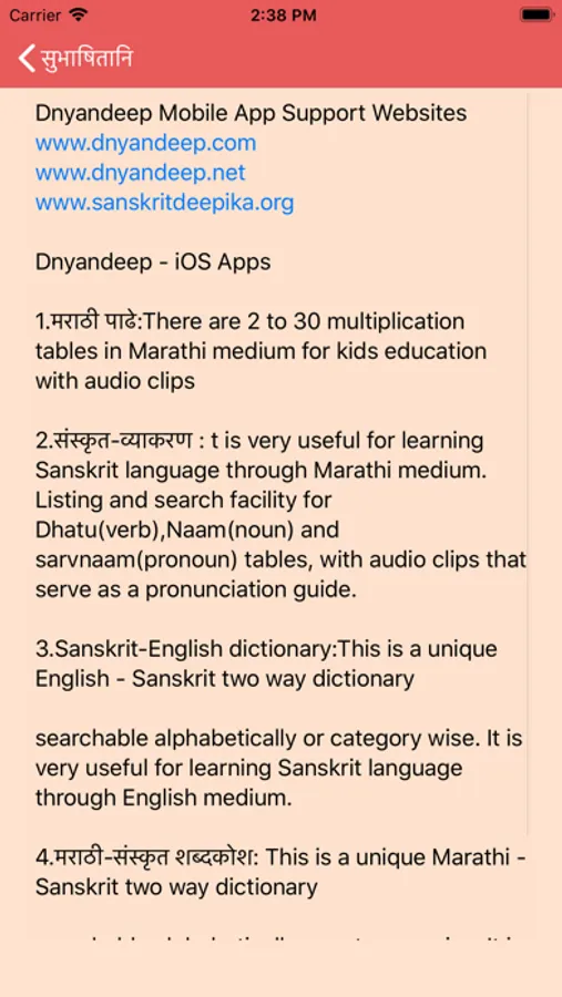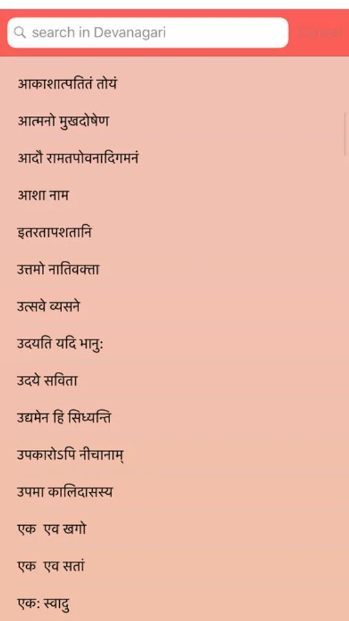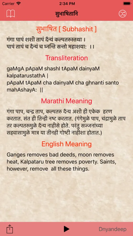 Sanskrit Subhashit (shloka) and their meaning in English ( with transliteration) as well as in Marathi, Audio clip to help you learn how to say. User can either pick a subhashit at random or search from a list.