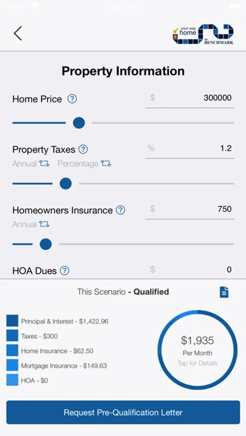 The Your Way Home app from Benchmark connects Home Buyers & Realtors with Loan Officers to learn which home loan they can pre-qualify for when searching for a home to purchase. If a home buyer is pre-qualified, they can print an official Pre-Approval letter to use when placing an offer on a house.
