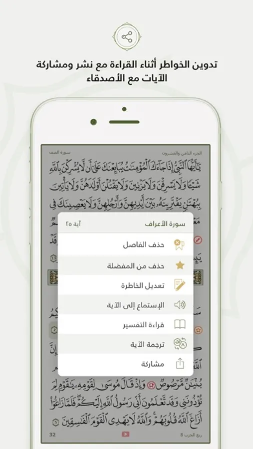 * شارك أياً من الآيات أو التفسير مع أصدقائك عبر الوسائط المتنوعة للمراسلة والتواصل الاجتماعي.