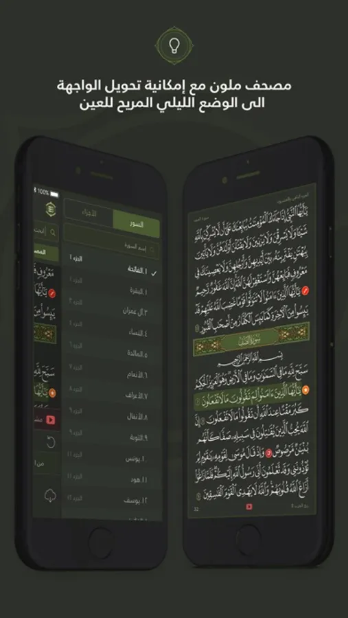 * تصفَّح فهرس بالسور والأجزاء والأحزاب، لسهولة الوصول إلى أي جزء بسرعة.