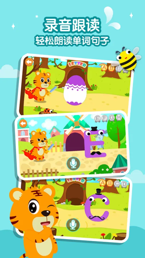 APP中的点击字母蛋、字母跟读、单词动画、徽章收集等适合儿童学习的课程设计,让儿童在游戏中不知不觉学习到自然发音的相关知识。