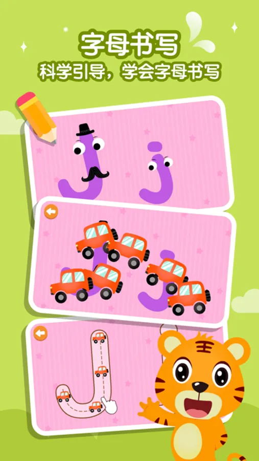 APP中将字母描红和发音练习、趣味动画有效地结合起来,让枯燥的字母书写不再乏味。