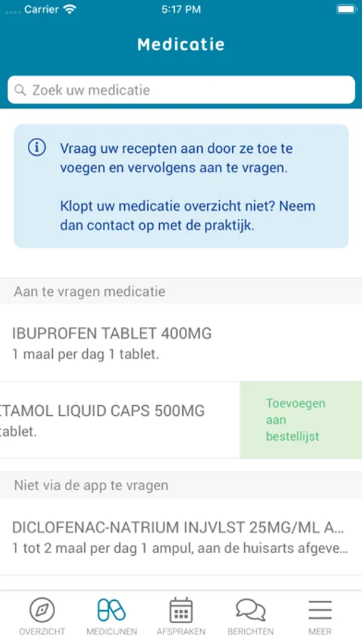 • Vraag herhaalrecepten direct uit uw medicatielijst aan en ontvang herinneringen indien u uw medicatie opnieuw nodig heeft.