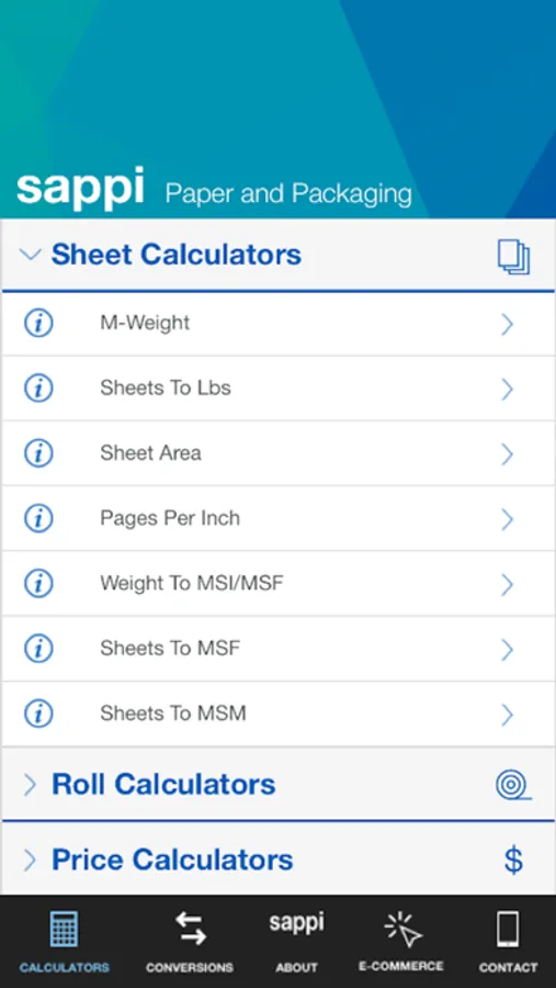 Sappi's Experience and Paper Calculator provides a comprehensive list of Sheet, Roll, and Pricing calculators in both Metric and Imperial units. It also features a handy tool for quick reference of Length, Weight, Area, and Trade Weight unit conversions. Each calculator provides access to both at a glance information pop-ups and more in-depth information screens which outline the purpose of each calculator and display working examples of the equations in use. The App's newest feature is our LIVE PRINT augmented Reality viewer, which enables access to an assortment of AR experiences located within Sappi's published material.