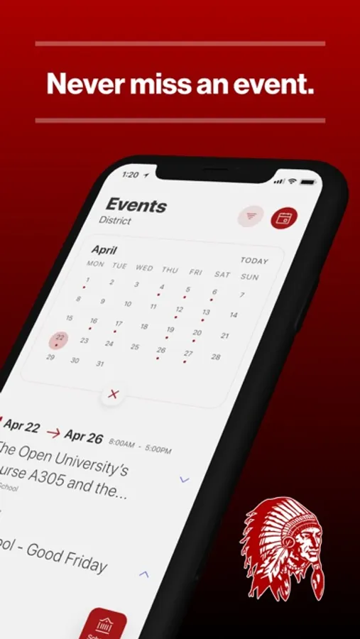 The event section shows a list of events throughout the district. Users can add an event to their calendar to share the event with friends and family with one tap.