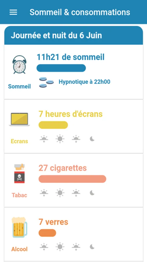 Nous recommandons d’utiliser l’application une fois par jour en début de journée pour renseigner le sommeil et les évènements de la veille ou en fin de journée si vous ne renseigner que vos comportements. Pour vous aider vous pouvez programmer une notification qui vous rappellera de saisir les informations relatives à la journée et à la nuit précédente.