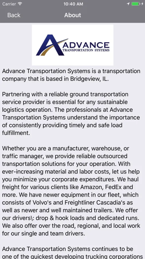 Advance Transportation Systems is a transportation company that is based in Bridgeview, IL. nnPartnering with a reliable ground transportation service provider is essential for any sustainable logistics operation. The professionals at Advance Transportation Systems understand the importance of consistently providing timely and safe load fulfillment. nnWhether you are a manufacturer, warehouse, or traffic manager, we provide reliable outsourced transportation solutions for your operation. With ever-increasing material and labor costs, let us help you minimize your corporate expenditures. We haul freight for various clients like Amazon, FedEx and more. We have newer equipment in our fleet, which consists of Volvo's and Freightliner Cascadia's as well as newer and well maintained trailers. We offer our drivers: drop & hook loads and dedicated runs. We also offer over the road, regional, and local work for our single and team drivers. nnAdvance Transportation Systems continues to be one of the quickest developing trucking corporations in Illinois. We offer a number of openings and are a main preference for many companies across the nation. We offer proprietor operators and company drivers a wide range of benefits and services. Our intention is to provide all of our drivers with flexible and solid employment.nnAdvance Transportation has safe, experienced drivers to ensure it is a bedrock in your overall logistics plan. If you are interested in working with us, please contact us at Info@advance77.com or 708-223-7650.
