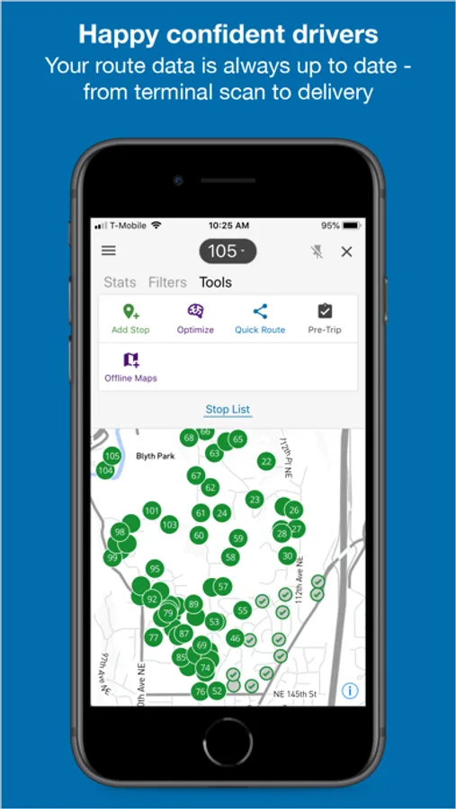 With your FedEx FCC data for all your service area. Your route data is automatically updated, plotted, sorted and organized. One tap to find any stop or package detail.