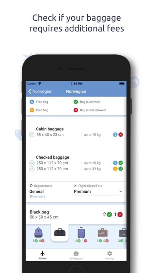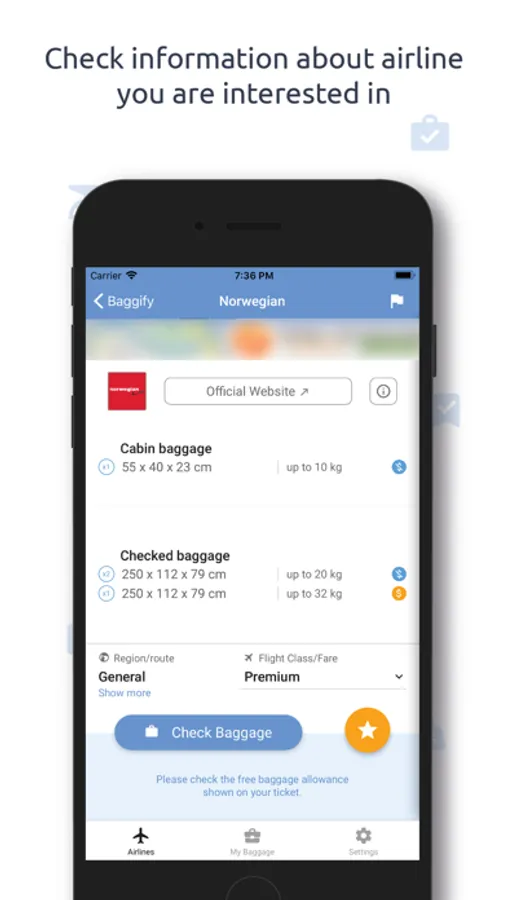 Baggify allows you to check if your baggage is suitable to take it to the aircraft cabin, whether you have to pay for your baggage dependent on the flight class/fare and how many units you will be allowed to take on board free of charge.