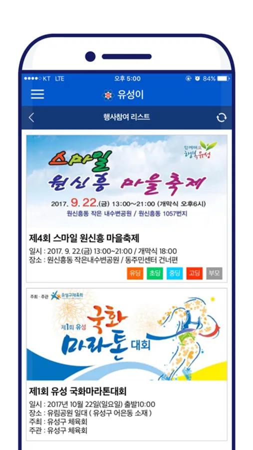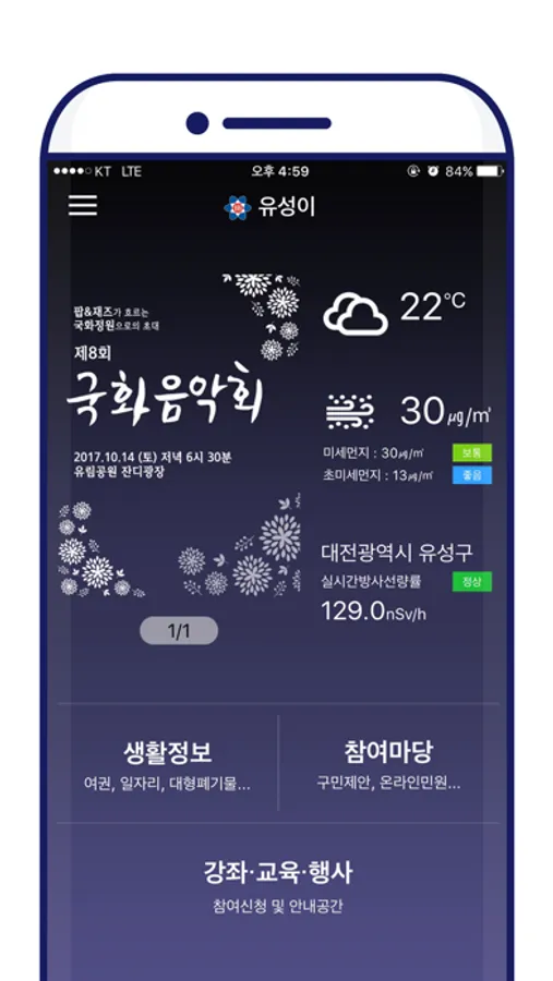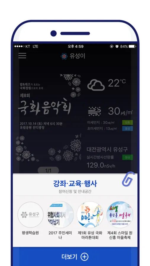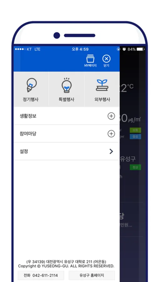 • 푸시 : 행사정보(행사신청, 평생학습센터), 지방세 납부 일정(유성알림), 내가 살고 있는 동 소식(동알림) 등 필요한 정보를 선택하여 골라 받아볼 수 있습니다.