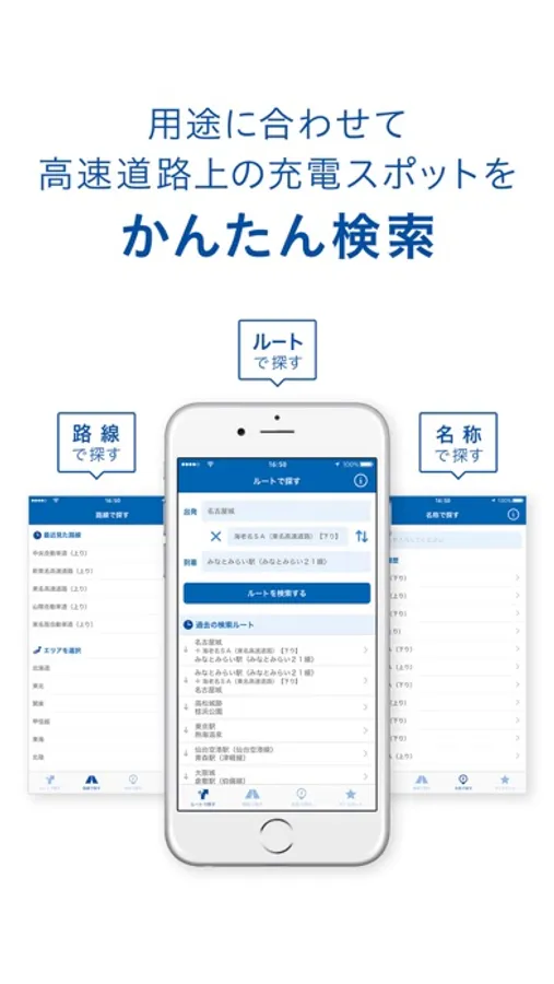 用途にあわせて、「ルート」・「エリア/路線」・「SA・PA名称」の3パターンから高速道路上の充電スポットを簡単に検索できます。ルート検索では、経路上の充電スポットと各間隔を略図で表示したり、地図上で確認することができます。