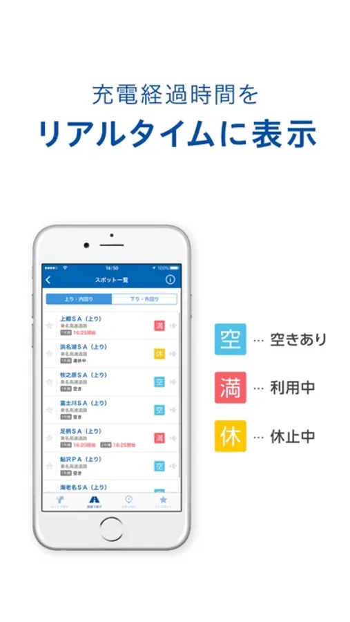 充電スポットの運休情報や空き状況、充電スポットが利用中の場合は充電経過時間をリアルタイムに表示します。これにより、充電スポットの状況を事前に把握することができ、充電待ちを回避したり、待ち時間の目安をつけることができます。