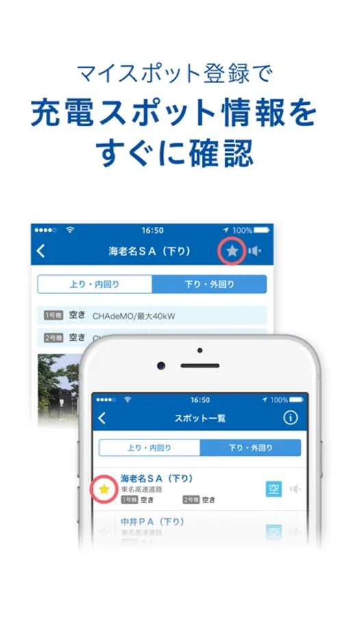 よく利用する充電スポットや次のドライブで使う予定の充電スポットなどをマイスポットとして登録しておくことにより、検索することなく充電スポット情報を確認できます。