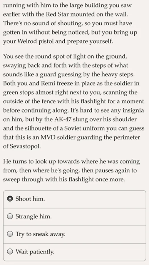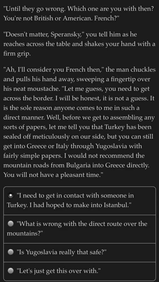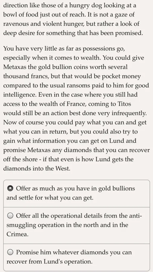 "Diamant Rose" is a 87,000 word interactive cold war novel by Teo Kuusela, where your choices control the story. It's entirely text-based—without graphics or sound effects—and fueled by the vast, unstoppable power of your imagination.