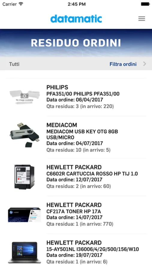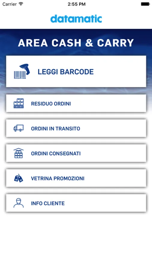 Questa app consente agli utenti registrati ed in possesso di un codice Cliente Datamatic di accedere in mobilità ad una serie di servizi come la consultazione della propria situazione ordini in transito, consegnati, residui, schede e specifiche prodotti.