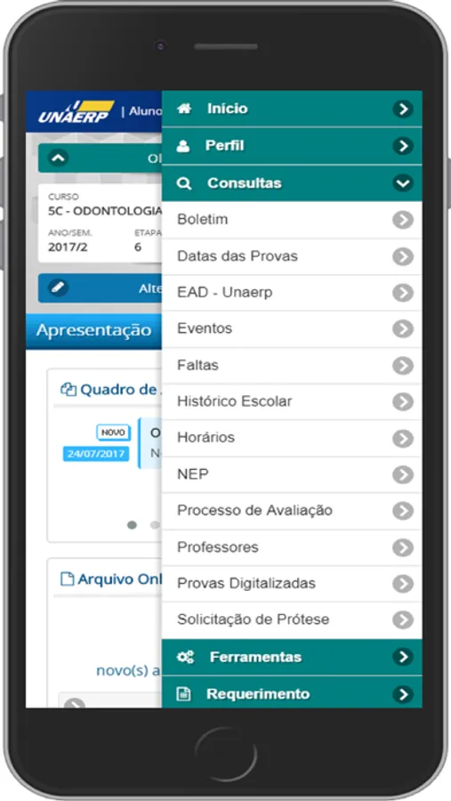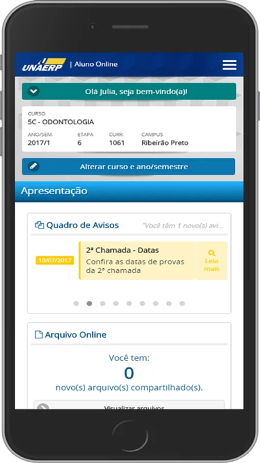 O Aluno Online da UNAERP agora está na palma de suas mãos na versão Aluno Online Mobile. Além de todas as facilidades de sua versão Web o Aluno Online Mobile conta com a melhoria de não precisar realizar login em todo acesso, e você receberá mensagens e notificações diretamente em seu dispositivo móvel.