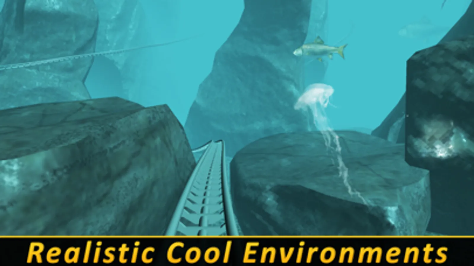 Feel how the roller coasters runs on the track through high- and low speed corners as you observe the detailed graphics of the ancient hidden temple. Run past trees and torches as you wiz by at ultra high speed! So much detail to observe... Are the temples Mayan, or maybe left by an alien race? No time to think as the journey continues to ride into the dark and scary caves and enjoy the sensation of gravity and speedy curves as you pass through the subterrane. Ultimately you'll dive into the water and be treated to an amazing underwater experience. See tropical fish in full animated detail as they life their underwater life.