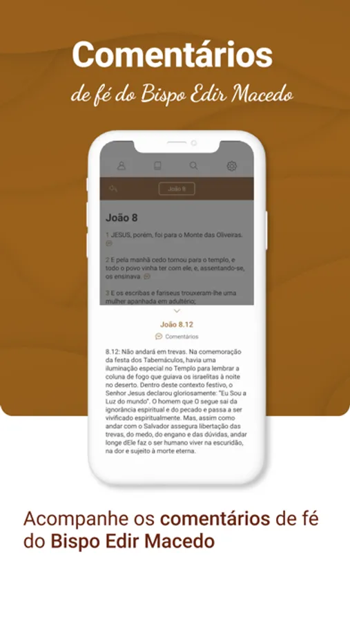 Neste aplicativo, você também contará com estudos, anotações e comentários do Bispo Edir Macedo, exemplo de fé e de conhecimento da Palavra de Deus, para facilitar o seu entendimento e auxiliar você, de forma clara e objetiva, a compreender os profundos significados dos textos sagrados.