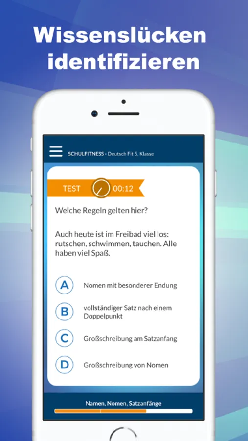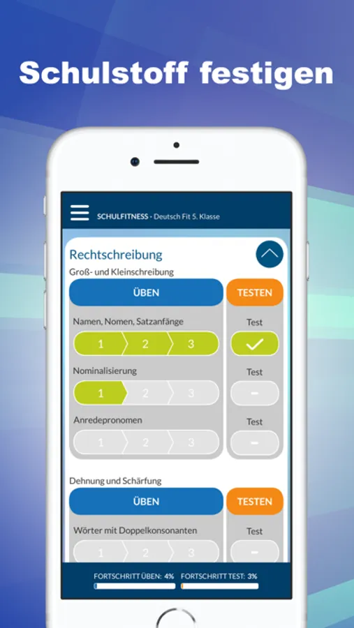 In der Schule ist die Zeit manchmal zu knapp, um den Schulstoff zu üben? Mach das doch einfach ruckzuck zu Hause oder unterwegs. Mit „Deutsch Fit“ übst du mit schnellen Aufgaben ganz einfach den Schulstoff oder wiederholst die Themen, an die du dich nicht mehr genau erinnern kannst. So verbesserst du ganz schnell und gezielt deine Noten – und das dauerhaft, weil du mit den Grundlagen auf sicheren Füßen stehst!
