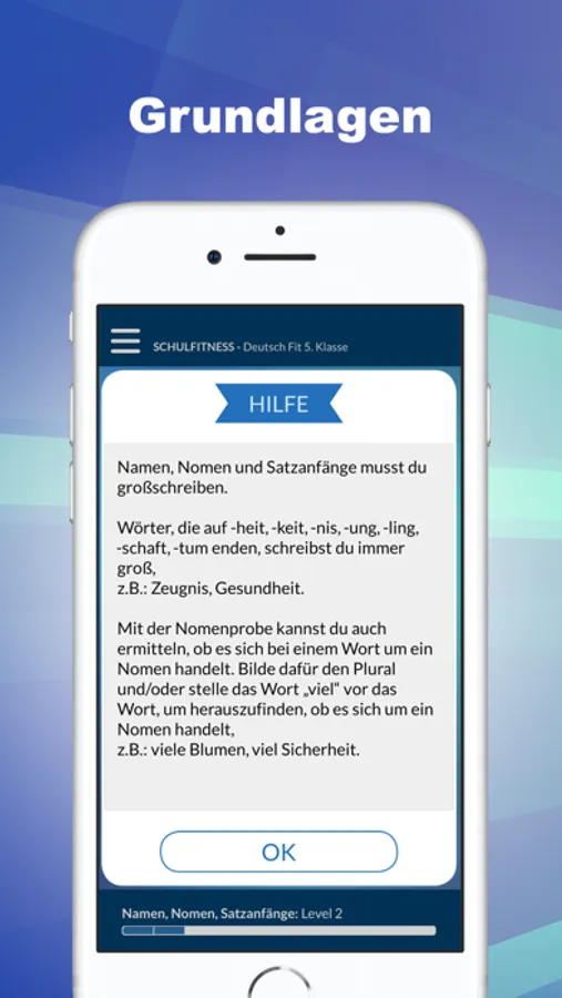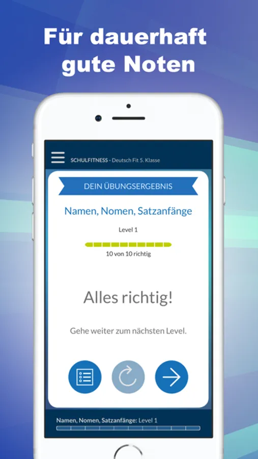 • Immer besser werden: Wenn du Bescheid weißt, geht es ab ins nächste von drei Levels – falsche Aufgaben werden wiederholt, bis du fit bist.