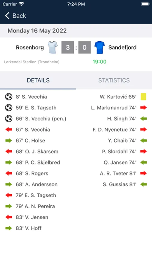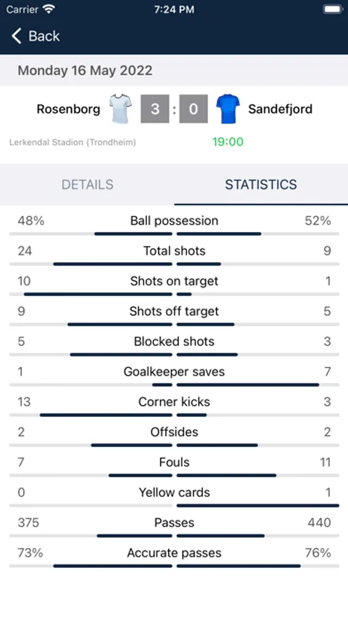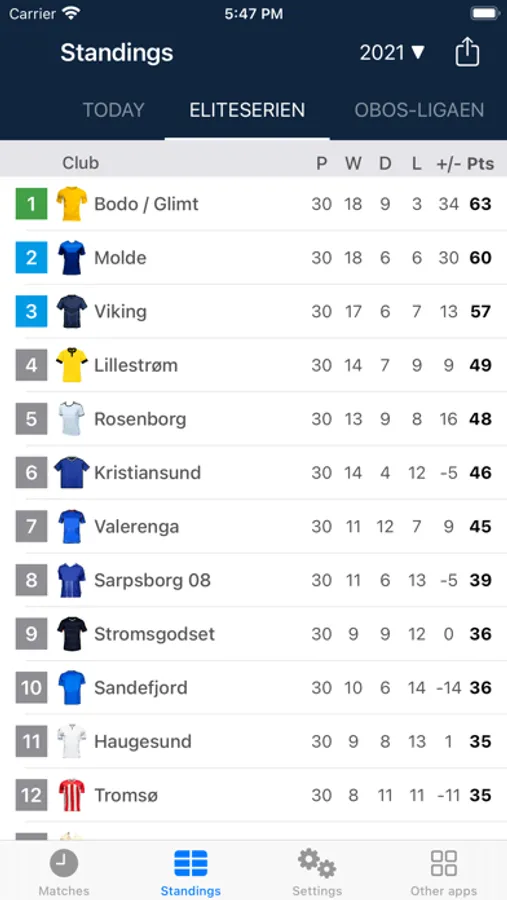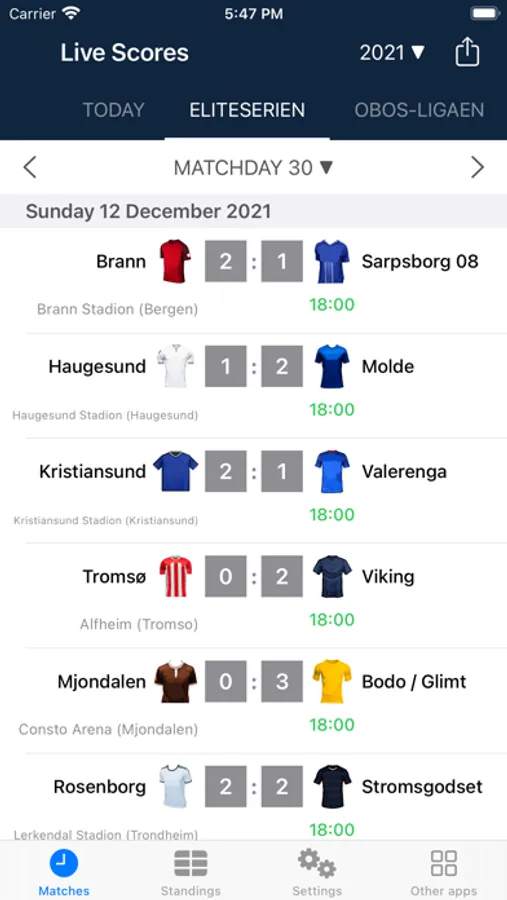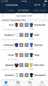 Live Scores for Eliteserien 2023 is the app that will allow you to follow the matches of Football Championship in Norway, even you do not have possibility to watch TV or live stream. It includes a schedule of matches, standings and results of Eliteserien, OBOS-ligaen, NM Cup and Super Cup. With the application you will not miss a goal or begin of a match, because it will send you a notifications. You can select favorite matches and receive notifications only for them. In Eliteserien season 2023 play the teams: Rosenborg, Ham-Kam, Sarpsborg 08, Odd, Aalesund, Tromso, Stabaek, Valerenga, Sandefjord, Stromsgodset, Lillestrom, FK Bodø/Glimt, Haugesund, SK Brann, Molde and Viking.