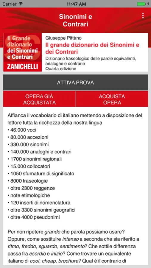 Puoi attivare una prova gratuita, che ti permette di effettuare 30 ricerche all’interno dell’intero dizionario, oppure puoi acquistare subito in modalità in-app.