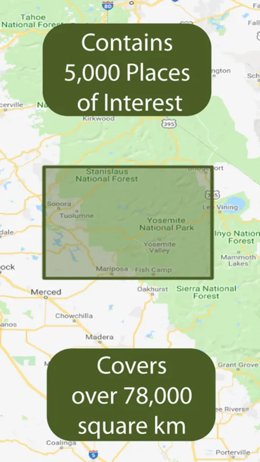 This version is for Yosemite and locates places within the National Park and beyond into the wider California and Nevada areas. The area covered encompasses a rectangle stretching north past Black Hawk Mountain in Tuolumne County, east past Mount Dana into Nevada, South past the town of Wawona and west to Merced. This is an area of over 3,000 sq miles (7,000 km2).