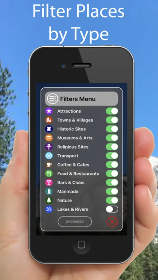 Categories that can be viewed and selected include Tourist Attractions, Hills, Lakes, Parks & Woodlands, Cities, Towns, Suburban Areas, Villages & Hamlets, Cafes, Restaurants, Cafes, Airports, Train & Major Bus Stations, Municipal Buildings, Places of Worship, Historic Sites and Museums & Arts.